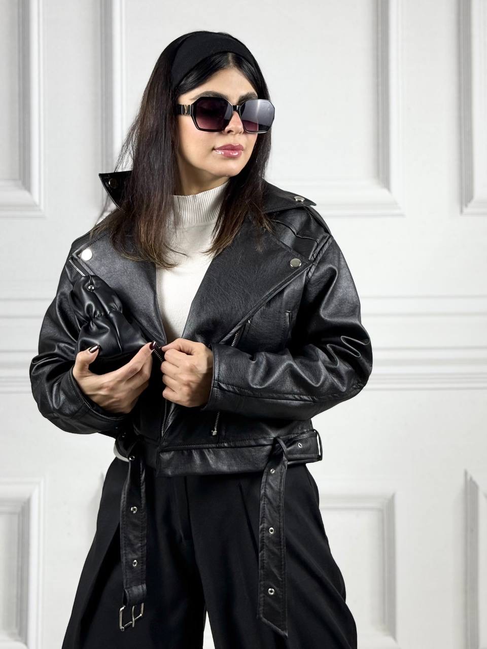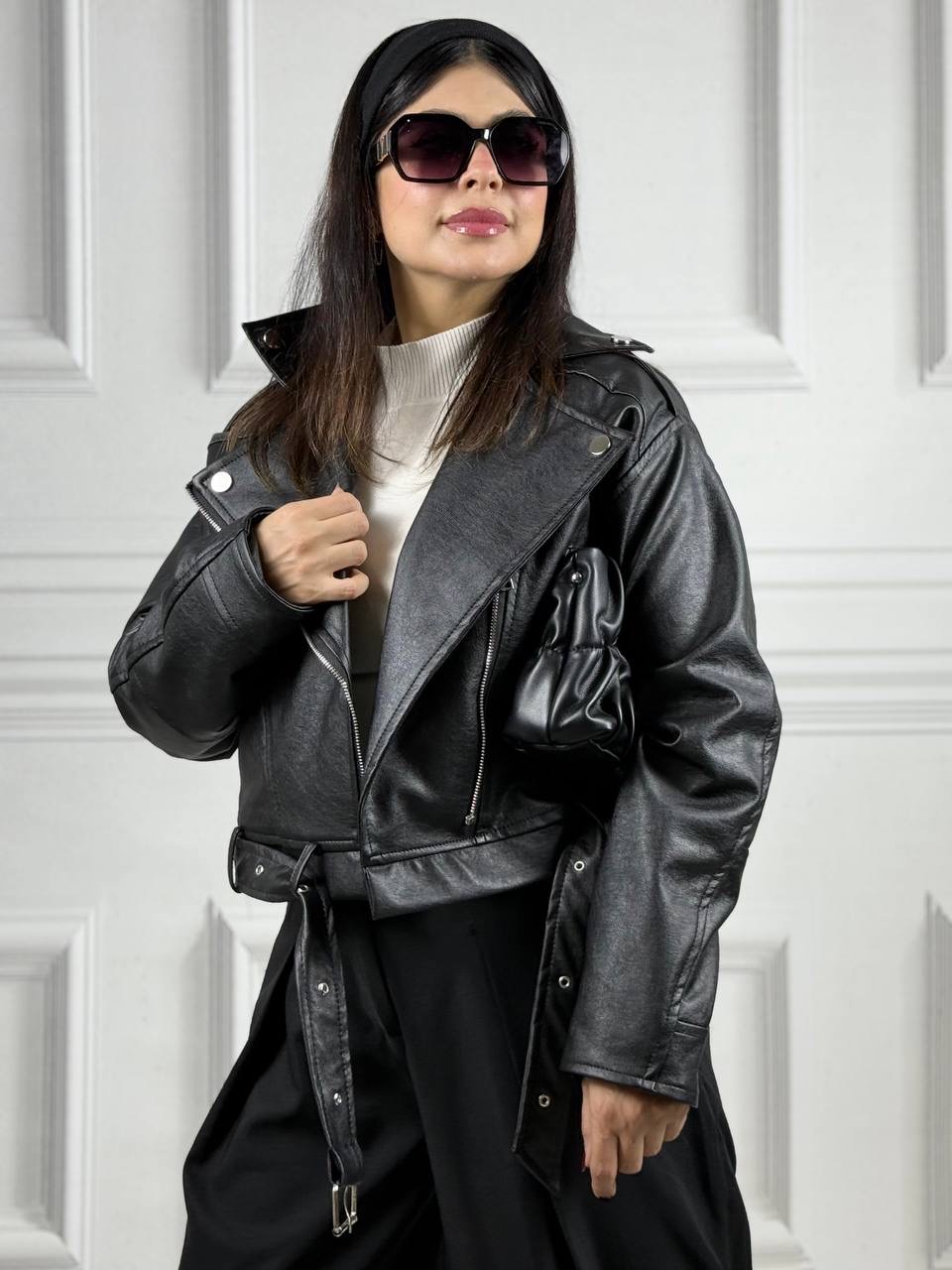 کاپشن چرم نکست ، چرم با کیفیت صنعتی با تنخور فوق العاده سایز بندی به صورت فری سایز بوده تا سایز ۳۶تا ۴۲ ، سایز مانکن ۳۸
